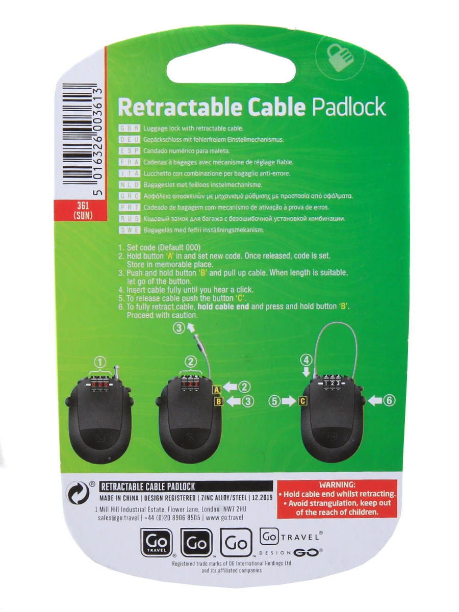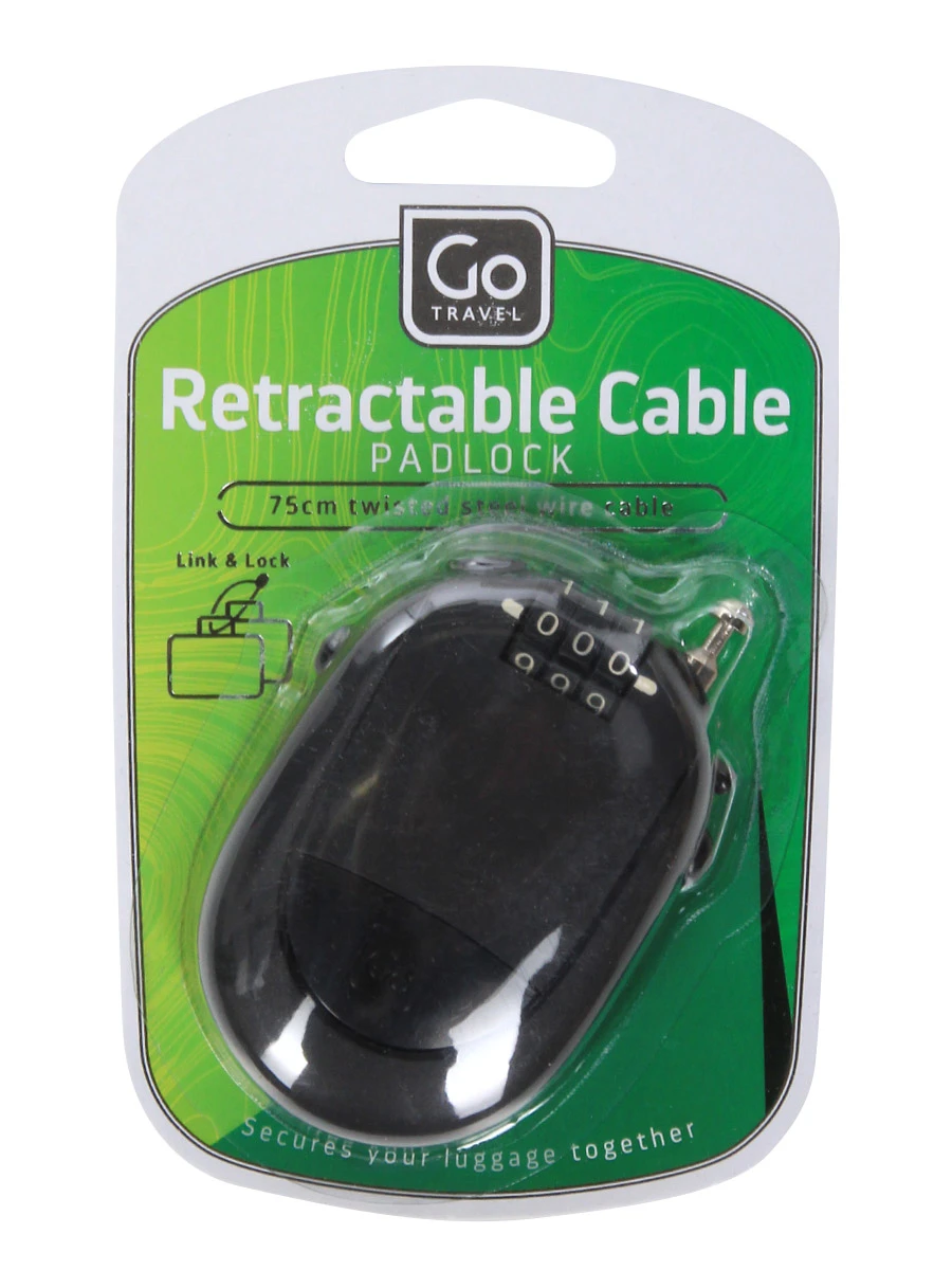 Le cadenas à câble Go Travel Sécurité est un accessoire de sûreté très pratique et multiusages. Son câble rétractable de 75 cm de long permet de sécuriser plusieurs éléments. Il est particulièrement indiqué pour les personnes voyageant en groupe et disposant donc de nombreux bagages qui peuvent être attachés ensemble. Il permet également de sécuriser plusieurs poches et compartiments d’un même bagage. Fabriqué en un solide alliage de zinc et d’acier, le câble est conçu pour résister aux tentatives d’effraction.