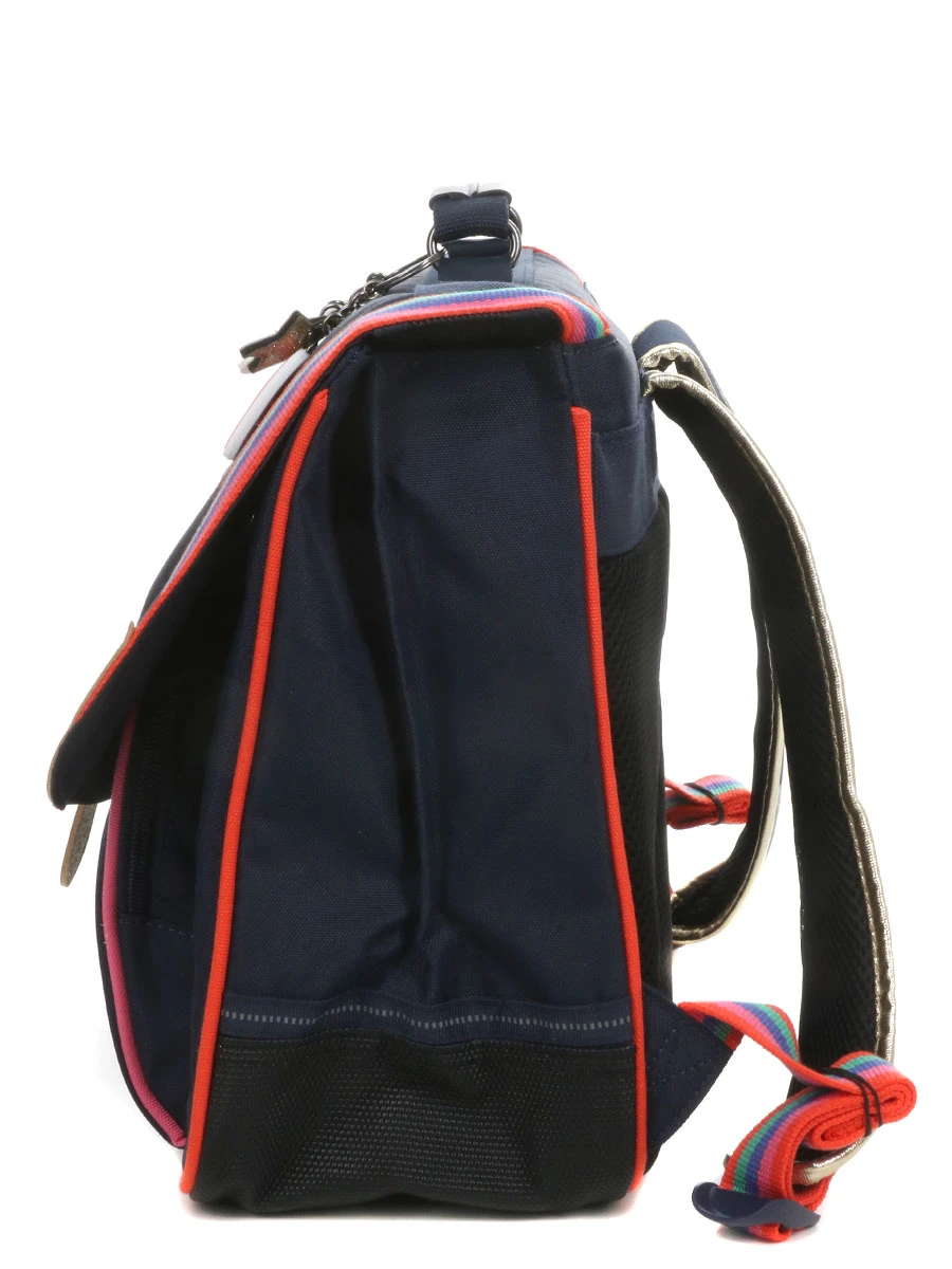 Le cartable Tann’s Leila 38 cm permet aux petites filles d’emporter une touche de feel good avec elles au quotidien. Pour un look plein de pep’s, un petit arc-en-ciel et une jolie étoile pailletée sont accrochés à la poignée supérieure. Grâce à son format compatible A4 et 24 x 32, ainsi qu’aux détails réfléchissants ornant son revêtement en polyester recyclé, il s’adapte parfaitement aux besoin des élèves du CP au CE2.