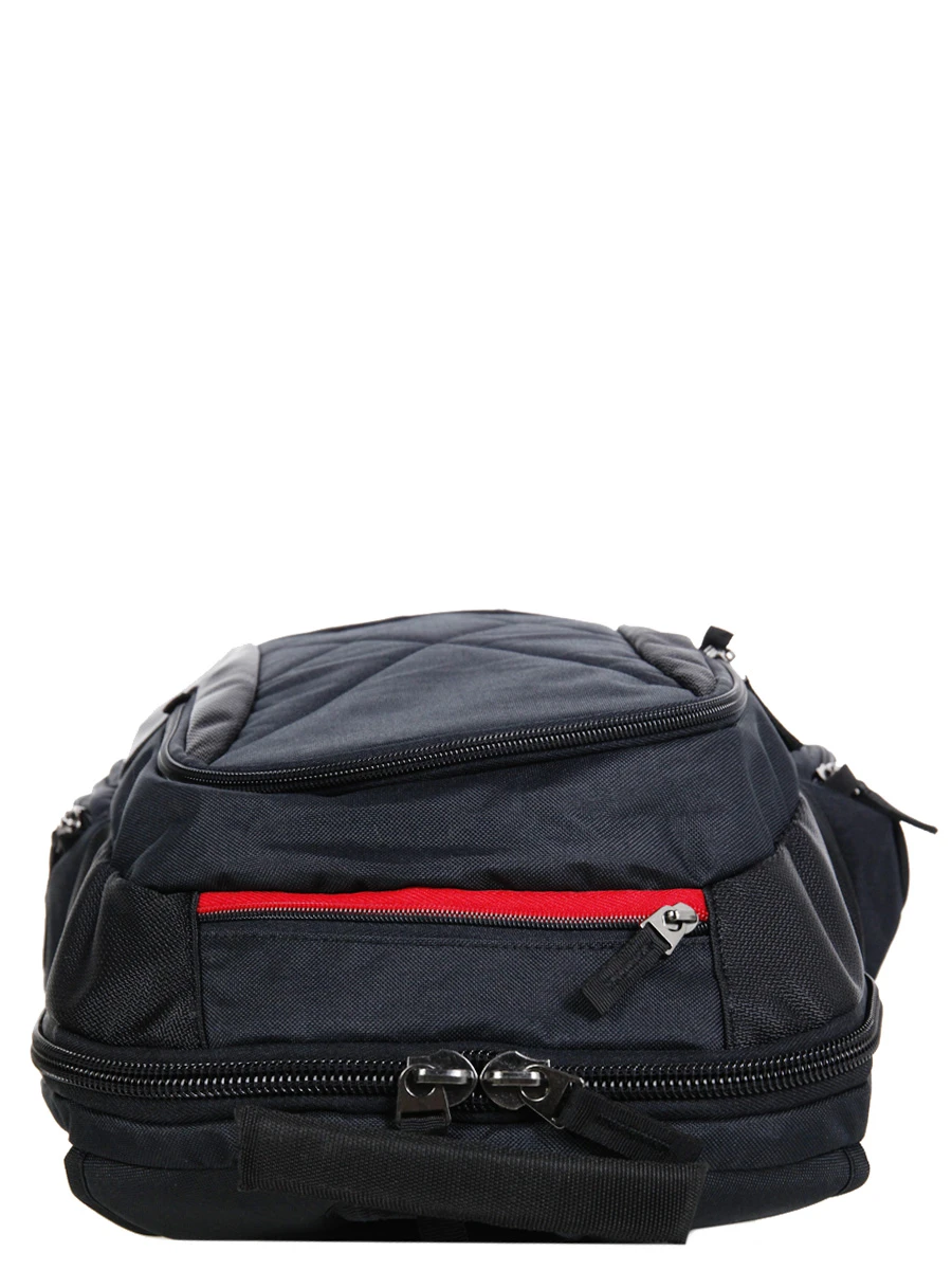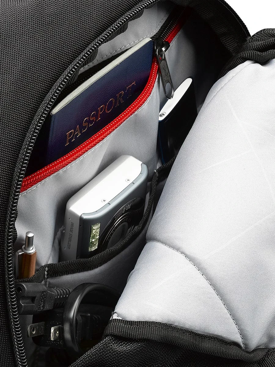 Côté extérieur, on trouve 2 poches latérales zippées, une petite poche frontale ainsi qu’une grande poche parfaitement organisée : plusieurs rangements pour téléphones portables ou cartes de visite, porte stylos, poche pour le cordon d’alimentation…