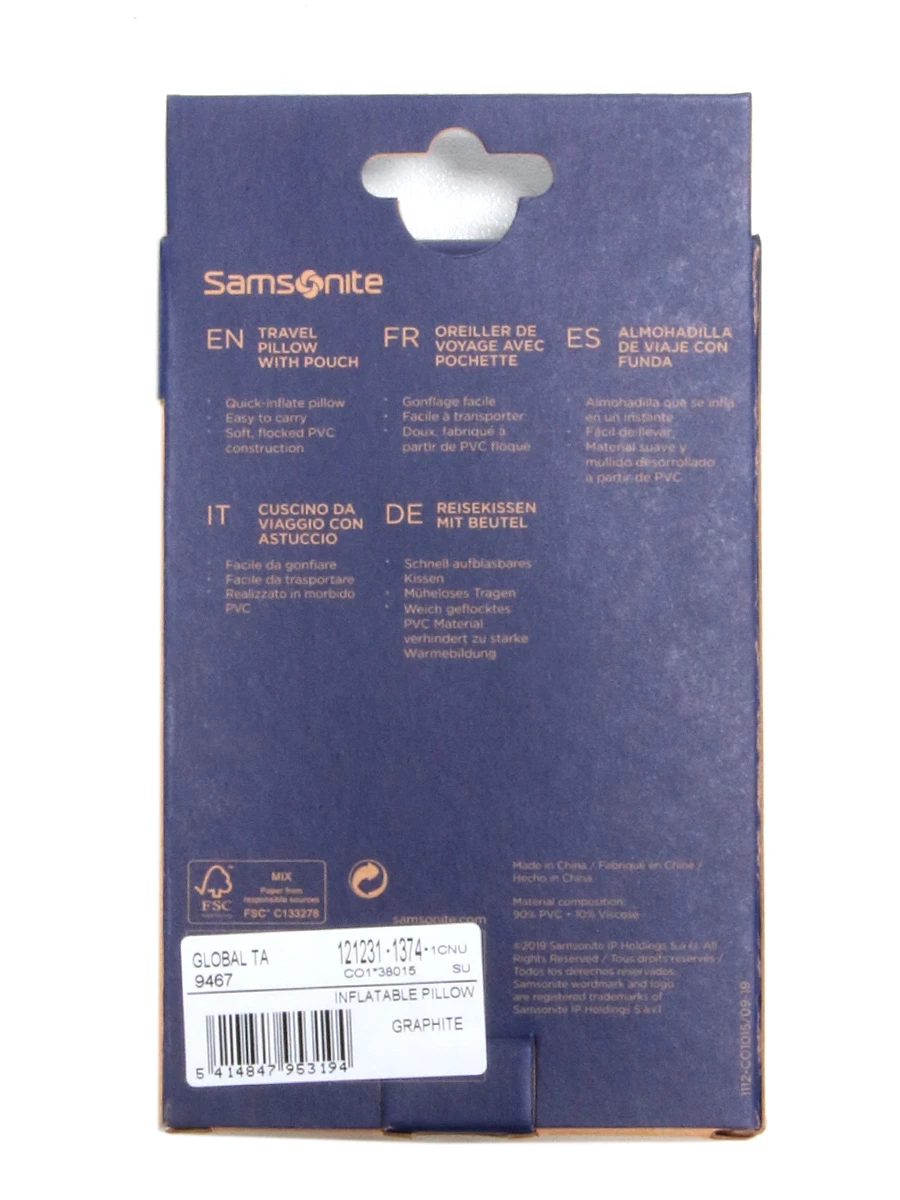 Le coussin Samsonite Comfort se gonfle en un rien de temps grâce à sa petite valve. En fonction des préférences de chacun, le gonflage peut être ajusté pour un soutien plus ou moins ferme. Une fois dégonflé, il peut être glissé dans sa petite pochette de transport pour être emporté dans le sac à dos ou la valise.