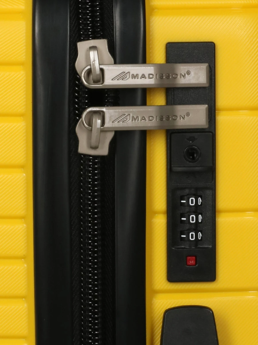 Pour une glisse sans accroc, les valises Madisson Naxos sont équipées de 4 roues doubles pivotantes à 360° et d’un trolley double canne à position ajustable. Ses poignées souples permettent un portage aisée à la main, notamment pour descendre quelques marches. Pour voyager en toute tranquillité, il est possible de verrouiller l’accès à leur contenu à l’aide de leur serrure à code encastrée. Enfin, pour une meilleure protection contre les chocs, leur coque est pourvue de renforts latéraux rigides.