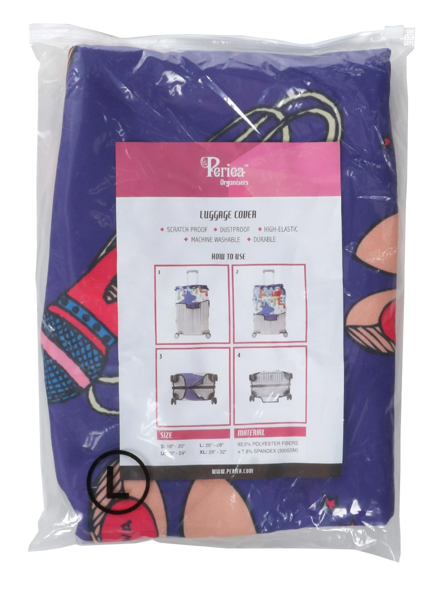 La housse de valise Periea Diva L met en avant la féminité avec ses motifs de talons hauts, tubes de rouge à lèvre et poudriers. Un imprimé original qui permet de mieux la repérer à l’arrivée en avion, sur le tapis roulant de l’aéroport. Par ailleurs, cette housse offre à la valise une certaine protection contre les petites éraflures et les salissures. Conçu en polyester et élasthanne, son tissu élastique s’ajuste à des valises soute d’une hauteur jusqu’à 78 cm. Ce matériau est d’un entretien facile, par lavage en machine.