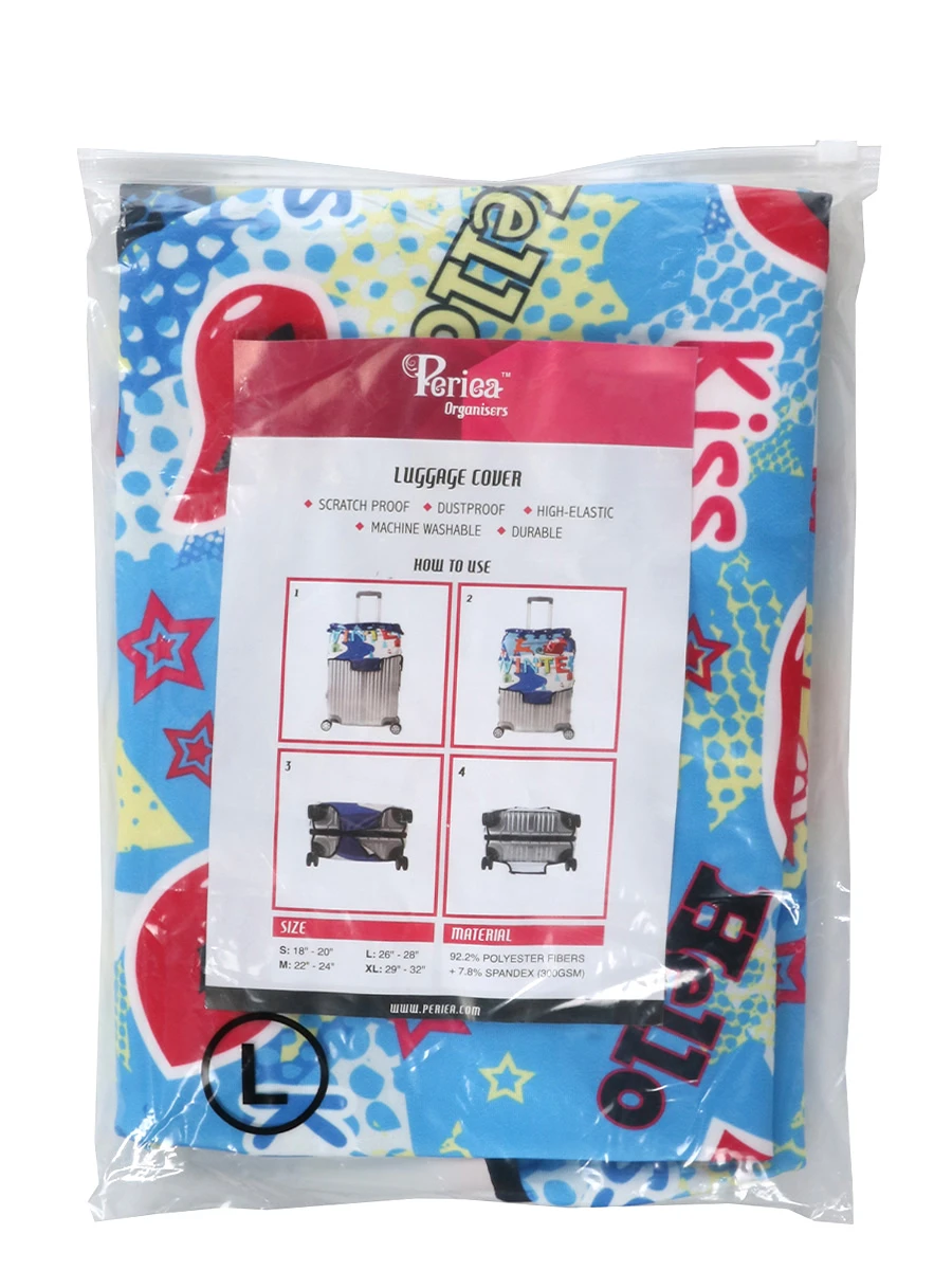 La housse de valise Periea Kiss L affiche des motifs voyants et colorés grâce auxquels votre bagage ne passe pas inaperçu : impossible de la manquer lorsqu’elle commence à tourner sur le tapis roulant de l’aéroport ou dans l’obscurité de la soute du car. Elle est fabriquée en un matériau en polyester et élasthanne aux multiples avantages. Extensible, celui-ci s’adapte à des grandes valises d’une hauteur jusqu’à 78 cm. Par ailleurs, il est d’un entretien facile, par lavage en machine.