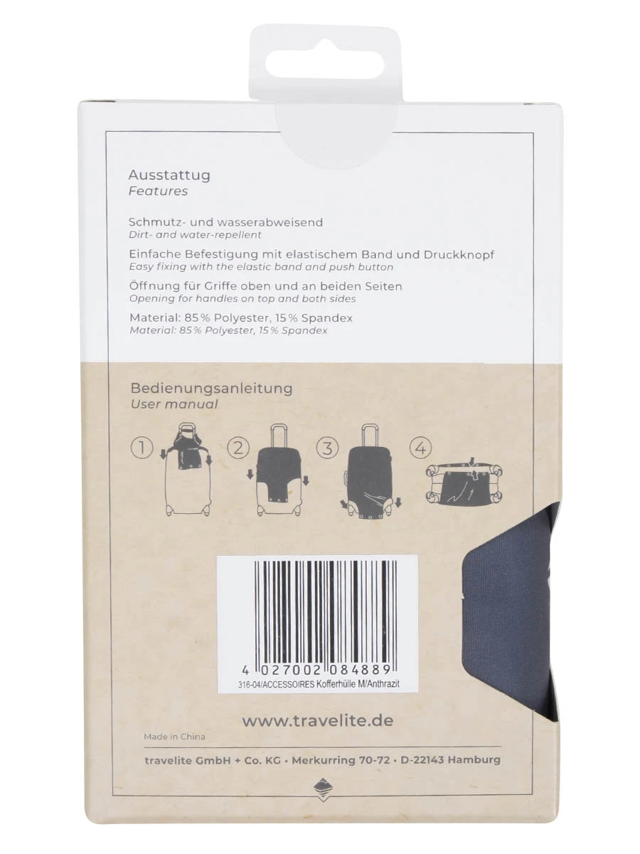 La housse de protection Travelite M se met en place aisĂ©ment en la glissant par le haut de la valise et en la faisant coulisser jusqu’en bas du bagage. Pour la fixer, il suffit d’utiliser ses boutons pression et le tour est jouĂ©. Les poignĂ©es de portage et le trolley restent quant Ă eux toujours accessibles grâce aux ouvertures prĂ©sentes sur le haut et les cĂ´tĂ©s de la housse. Pour ne rien gâcher, elle bĂ©nĂ©ficie d’une garantie de 2 ans.