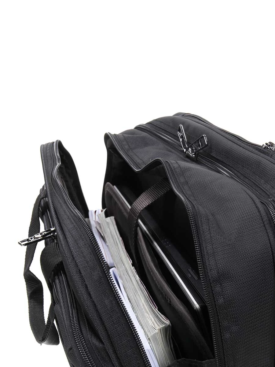 Il est aussi constitué de 3 poches frontales dont une poche organiseur, avec poches PDA et passants pour stylos, et d’une poche arrière à zip pour les papiers importants à garder près de soi.