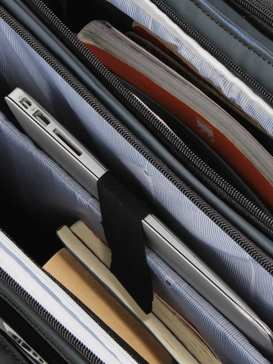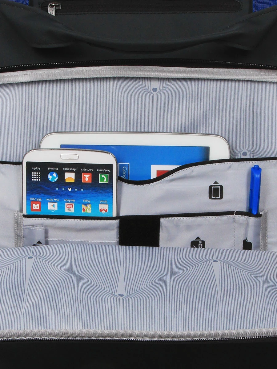 Le pilot case 2 roues Delsey Parvis Plus Imperméable possède un compartiment arrière muni d’un trieur souples parfaits pour sérier quelques documents de travail. Là, si nécessaire, un peu de linge et une trousse de toilette trouvent une place de choix. Son compartiment avant renferme quant à lui une poche matelassée pouvant accueillir un ordinateur jusqu’à 17.3 pouces et une poche zippée idéale pour les câbles et cordons d’alimentation. Pochettes, revues techniques et mémos peuvent également y être rangés dans ce compartiment. Sa grande poche frontale fourmille d’options de rangement astucieuses comme sa poche pour tablette, sa poche pour téléphone, ses poches cartes de visite ou ses passants pour stylos. Au dessus, une dernière petite poche à zip permet de laisser accessibles un trousseau de clés ou un pass pour les transports.