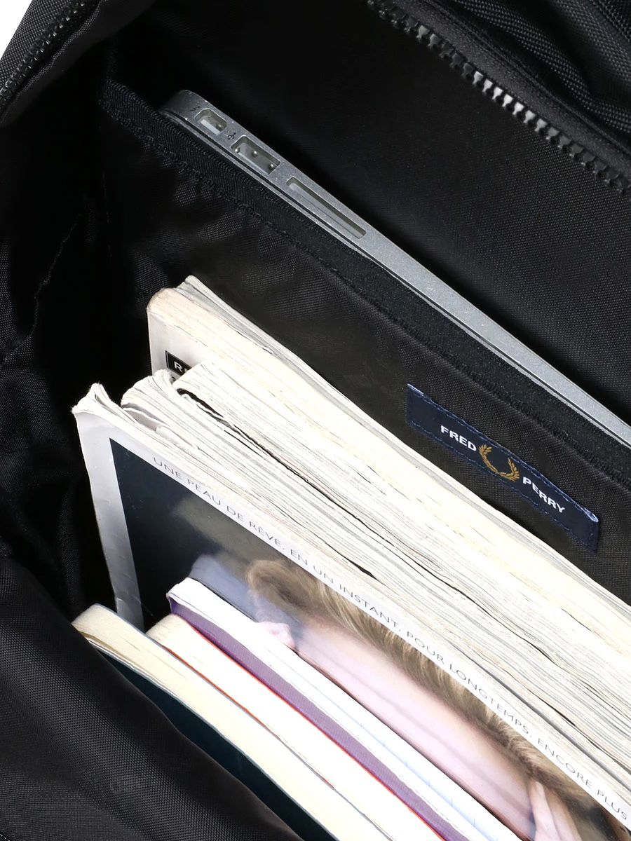 Le compartiment du sac casual Fred Perry Contrast Tape est suffisamment spacieux pour y ranger des documents A4 ou un peu de linge en fonction des besoins de la journée. Sa poche renforcée est adaptée pour une tablette ou un ordinateur jusqu’à 15.6 pouces. Cordons d’alimentation et divers câbles peuvent être sériés dans sa poche zippée. Ses 2 poches frontales permettent de laisser accessibles le téléphone, le portefeuille… Sur les côtés, 2 poches porte bouteille complètent le tout.