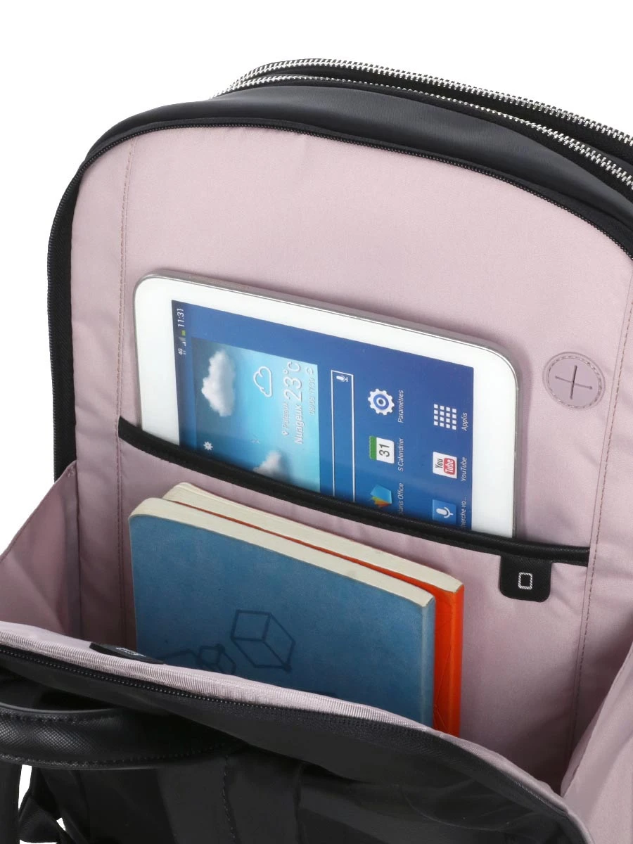 Le sac Samsonite Zalia 3.0 dispose de 4 grandes poches frontales parfaites pour sérier les effets personnels à laisser à portée de main. Dans l’une d’elle, un petit mousqueton permet de garder accessible un trousseau de clés. Sa petite poche latérale zippée renferme une poche porte bouteille rétractable pour ne pas nuire à son style lorsqu’elle n’est pas utilisée. A l’arrière, une dernière poche est discrètement intégrée à son dossier pour ranger en sécurité certains papiers importants.