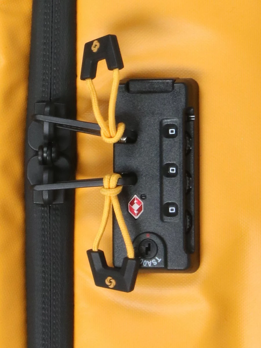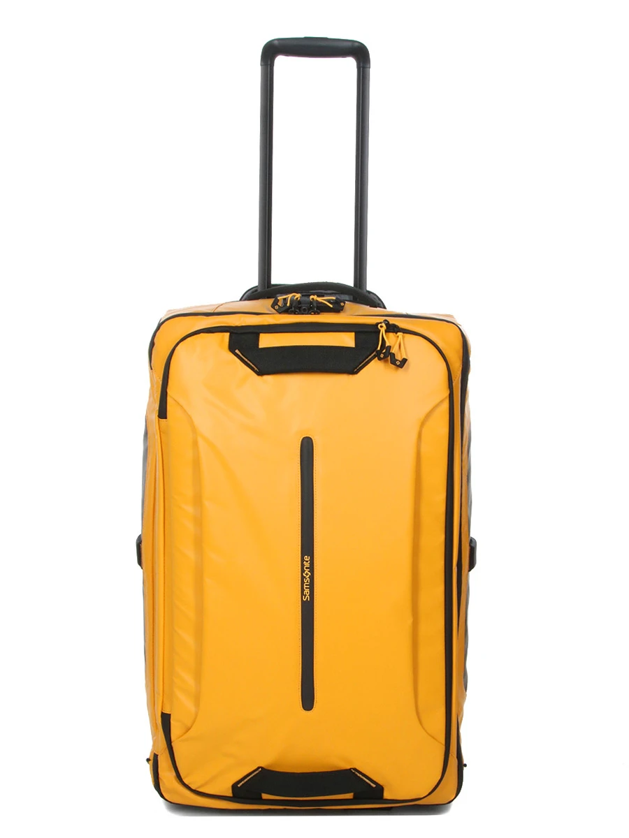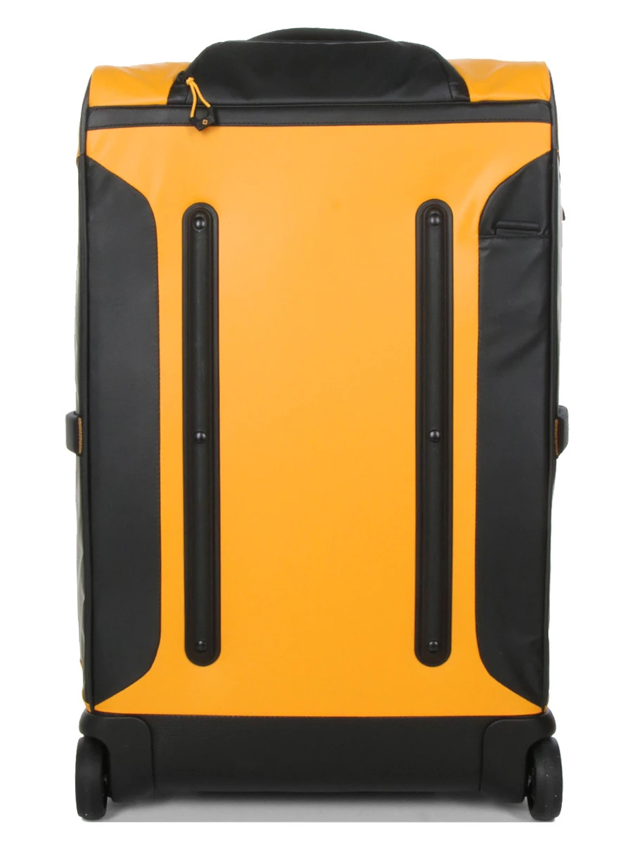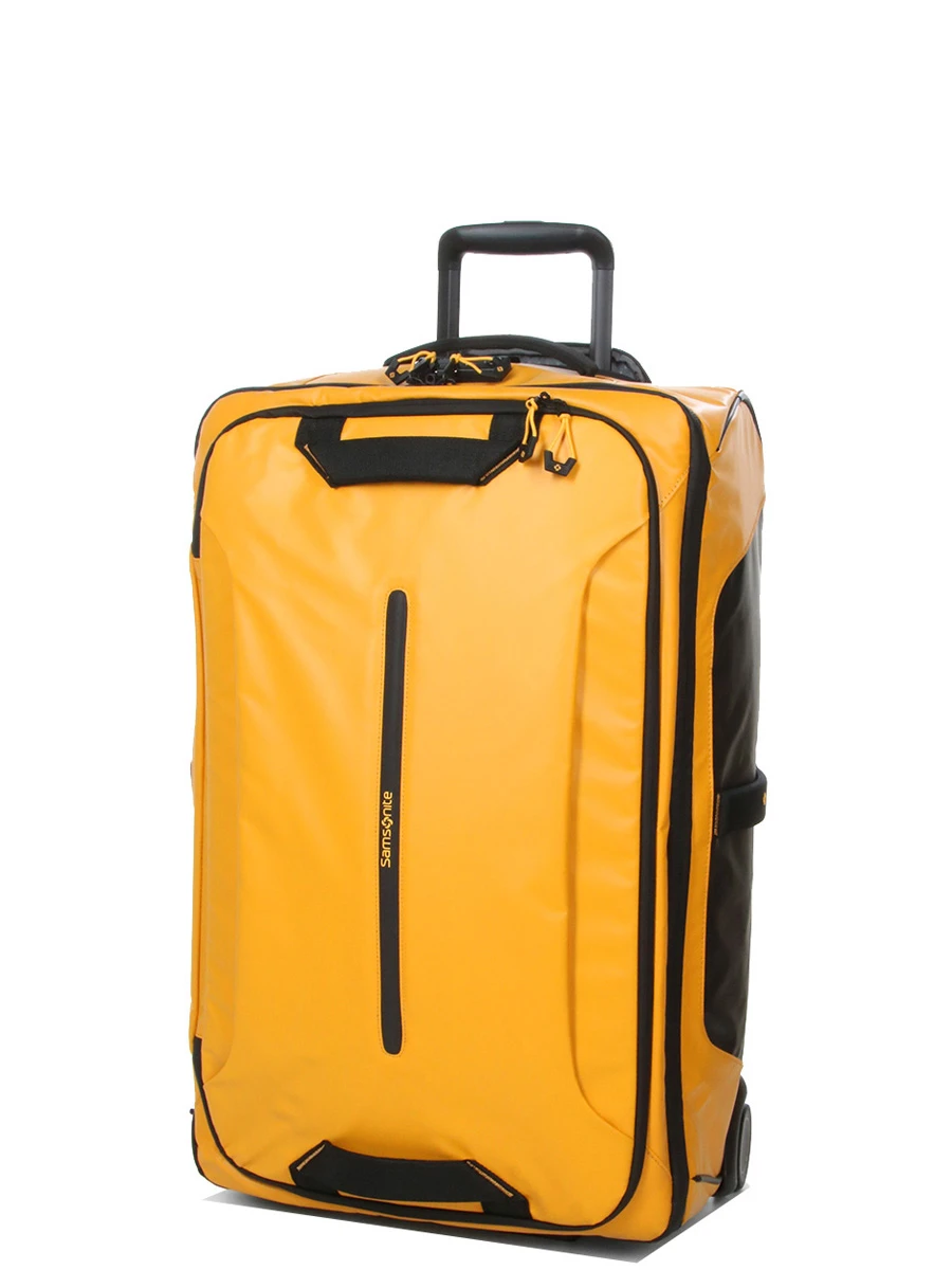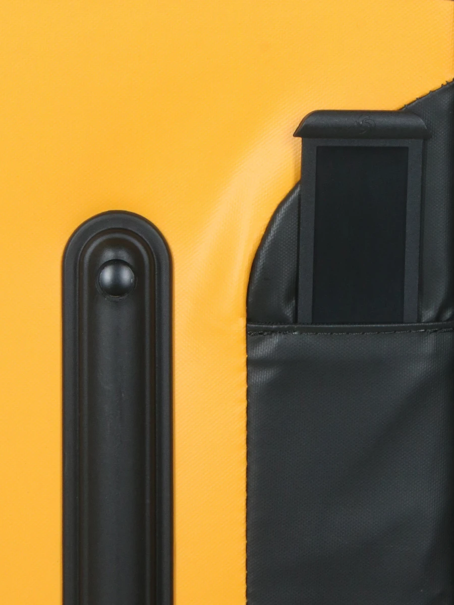 Le sac de voyage imperméable Samsonite Ecodiver est équipé de deux roues et d’un trolley double canne ajustable pour un grand confort de roulage. Le trolley peut être dissimulé dans la poche zippée. Pour pouvoir le soulever aisément, il est doté de cinq poignées de portage matelassées et de patins de protection conçus pour offrir une prise supplémentaire. La serrure TSA facilite les contrôles des services douaniers tout assurant la sécurité du contenu. Pour être vu pendant la nuit, il dispose de détails réfléchissants. Il est fourni avec quatre autocollants à remplir et placer sur le porte étiquette rétractable.