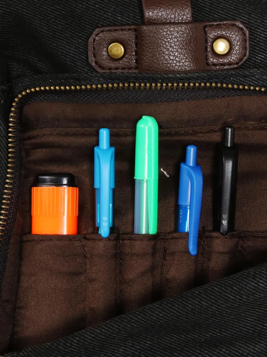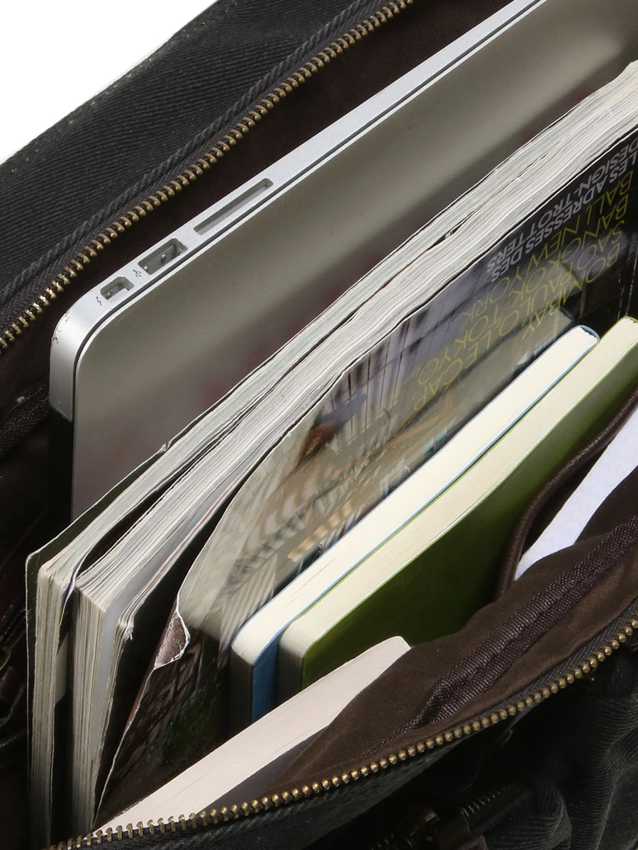 La sacoche Kinston Machu Pichu possède un unique compartiment entièrement doublé. Là, un ordinateur 15.6 pouces peut être glissés dans une poche matelassé tandis que les chargeurs peuvent être sériés à part dans sa poche zippée. Des documents A4 et des revues techniques peuvent également y trouver une place. Pour les fournitures de bureau, on peut opter pour l’une de ses 2 poches plates. A l’avant, 2 poches ouvertes et 2 poches zippées permettent de ranger à portée de main des cartes de visite, un téléphone, un carnet de note, des stylos. A l’arrière, 2 poches complémentaires sont propices aux ajouts de dernière minute.