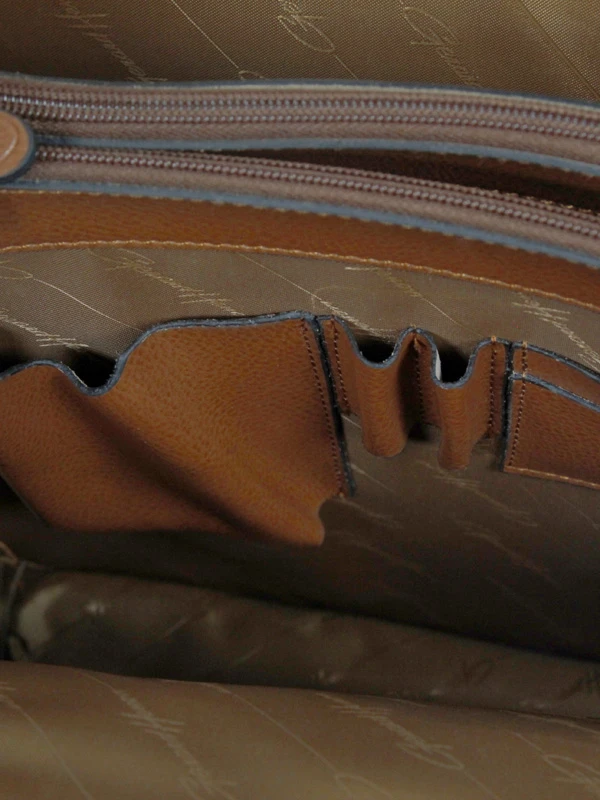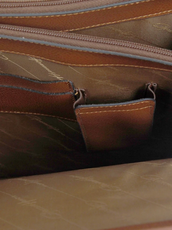 A l’intérieur, la serviette Gérard Henon Atout dispose de 3 espaces de rangement séparés par deux grandes poches zippées. Le premier espace de rangement est équipé d’une poche pour téléphone portable, de compartiments à stylos et de poches pour cartes de visite.