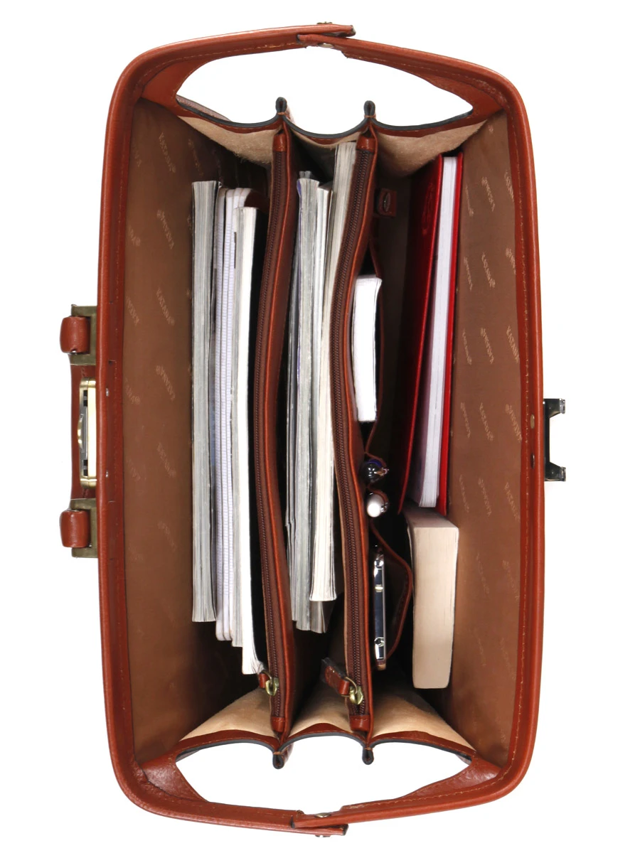 Ce cartable Katana Specialist – 3 soufflets se cloisonne avec une fermeture à attache métallique façon diligence munie d’une serrure à clef. La poche avant se ferme elle aussi avec un système d’attache doté d’une serrure à code cette fois-ci. Pour le manipuler, il se porte à la main à l’aide de son anse de portage en cuir rigide. Il est fourni avec une housse de rangement qui le gardera à l’abri des salissures lorsqu’il n’est plus d’utilité.