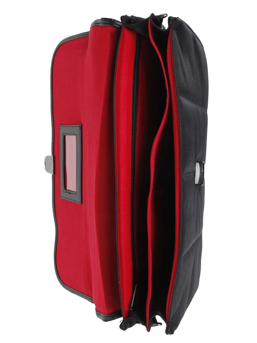 La serviette Davidt’s Monte-Carlo utilise un système de fermeture avec attache, sécurisé par une serrure à clé. A l’intérieur, elle est pourvue de 2 soufflets de rangement avec une belle doublure colorée. Le premier espace dispose d’une grande poche zippée, le second d’une plus petite poche, d’une poche plate, de porte stylos et d’emplacements pour cartes de visite et CB. On trouve également un porte étiquette sur le rabat.