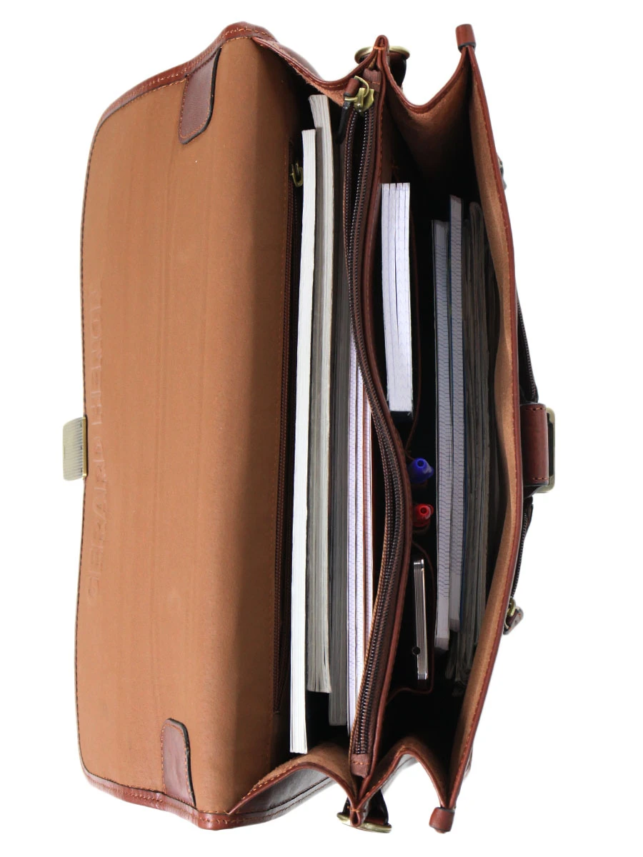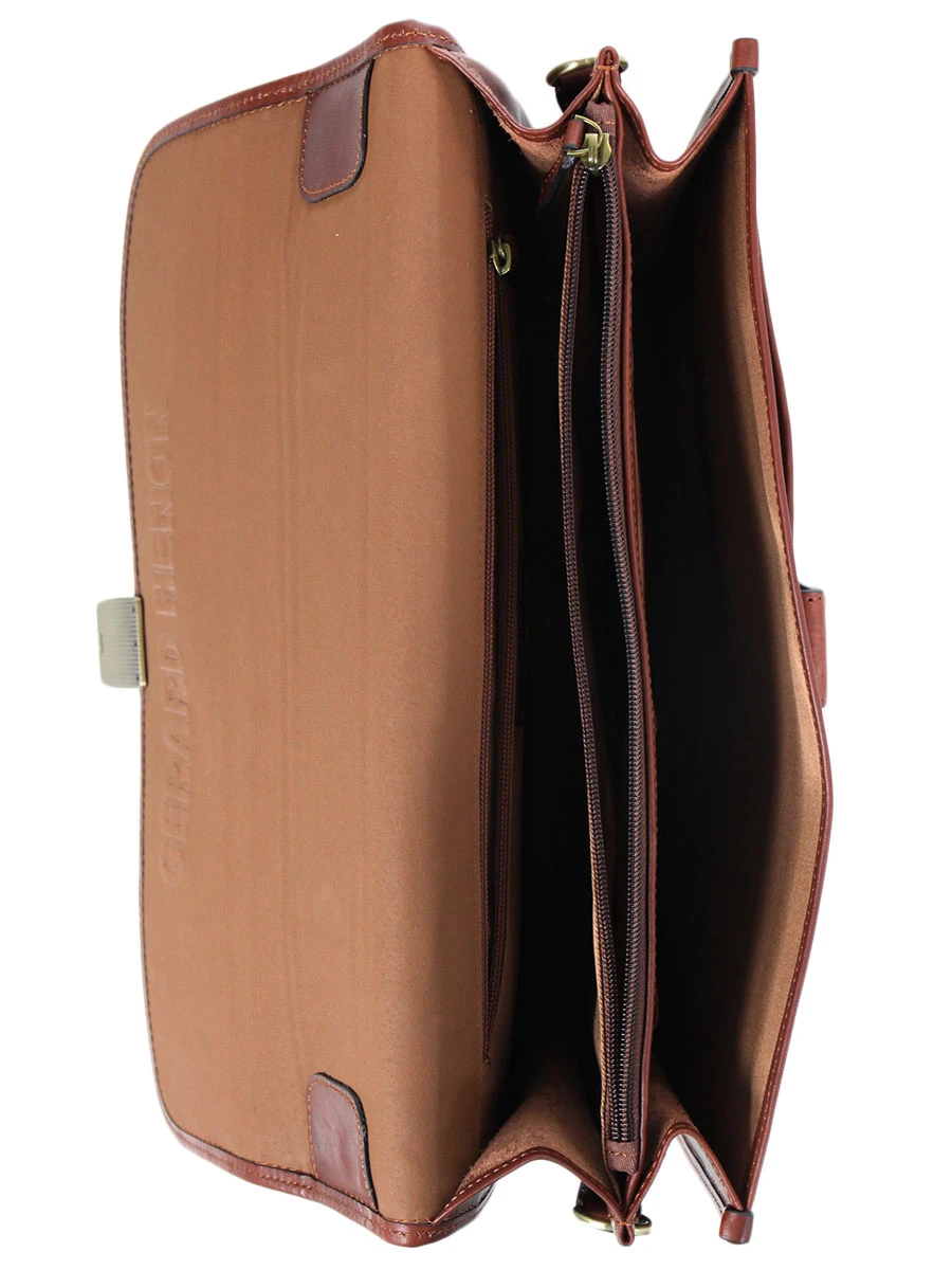 La serviette en cuir Gérard Hénon Renaissance séduira les hommes qui aiment ranger leurs affaires avec organisation. Elle est dotée de 2 larges compartiments doublés, dans lesquels se trouvent deux grandes poches à zip d’un côté, et des poches PDA et des passants pour stylos de l’autre.
