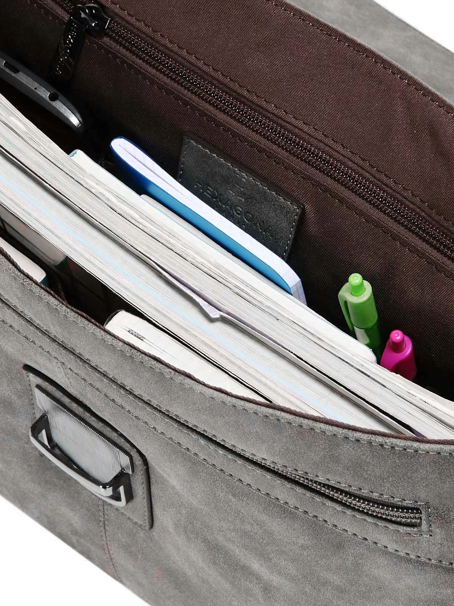 La serviette Hexagona Différence permet d’emporter avec soin les documents nécessaires au bon déroulement de la journée de travail (feuilles volantes A4, pochettes, revues techniques…). Pour retrouver en un rien de temps le trousseau de clés et le téléphone, on peut compter sur des options de rangement spécifiques. Petits accessoires multimédia, calepins et stylos peuvent être glissés dans l’une de ses 2 poches ouvertes ou dans sa poche zippée.