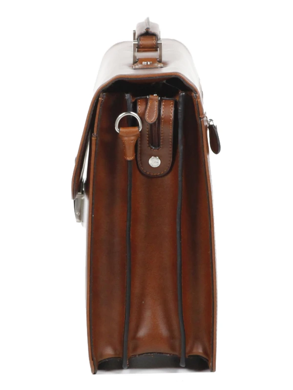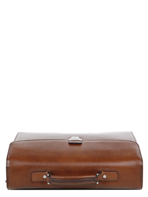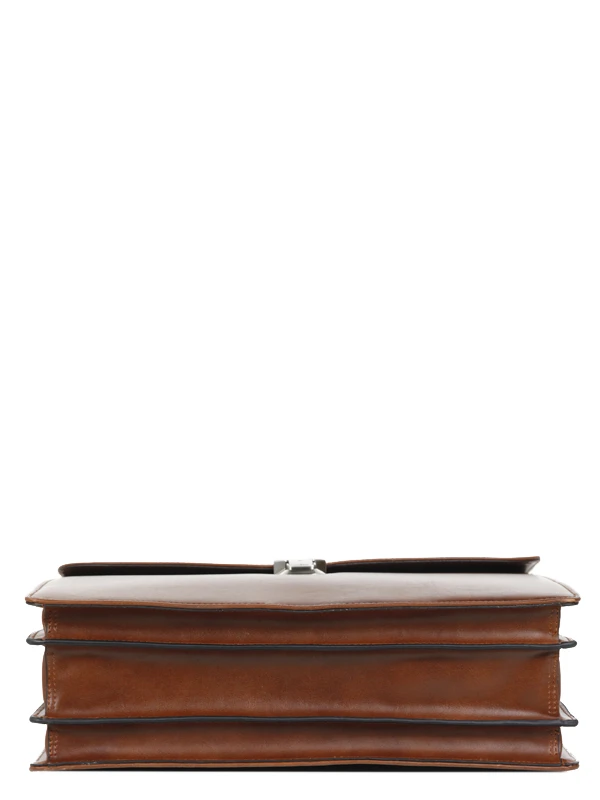 A l’extérieur, ce sac business offre, en complément, une grande poche avant avec empiècement en cuir et emplacements pour cartes de visite, ainsi qu’une poche zippée, située au dos. Ce porte documents se ferme à l’aide d’une fermeture à attache métallique, sécurisée par une serrure à clé.