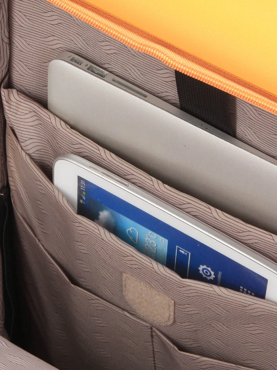 - sa grande poche frontale munie de 2 poches renforcées pour tablette et ordinateur 14 pouces et de 2 poches pour fournitures,