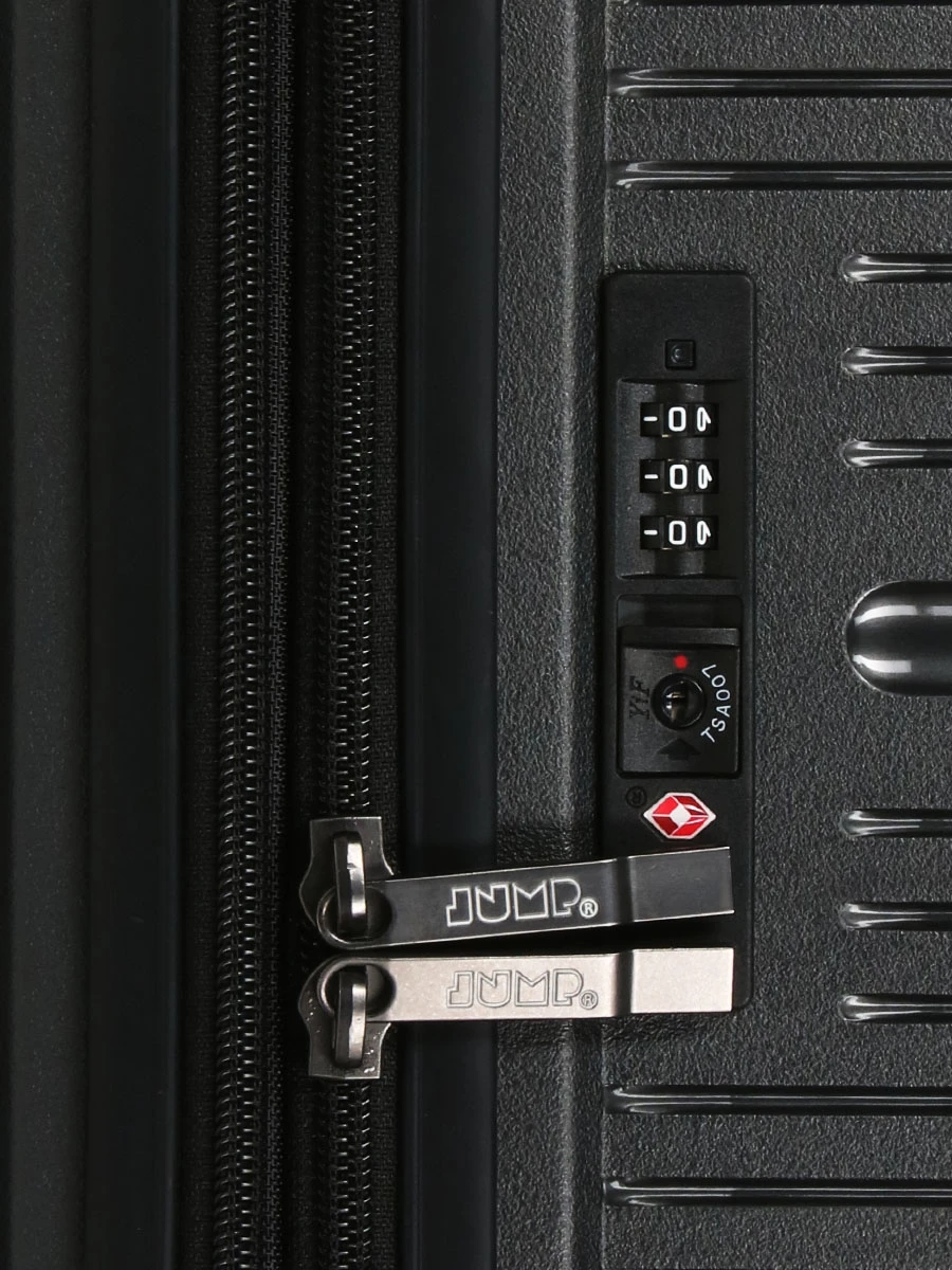 La valise Jump Sondo glisse avec fluidité sur ses 4 doubles roues. A l’aide de son trolley à double canne, il est ainsi possible de la tracter derrière soi ou à ses côtés. Sur le dessus et le côté, 2 poignées de portage souples permettent de la tenir aisément à la main si cela s’avère nécessaire (pour la déposer dans le coffre d’un véhicule…). Sa serrure TSA à code à combinaison chiffrée personnalisable permet quant à elle un verrouillage simple et efficace pour des trajets en toute tranquillité.