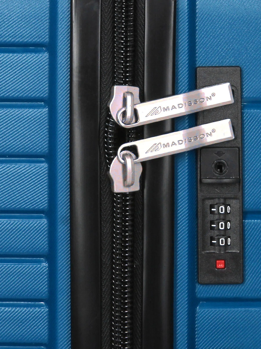 La valise Madisson Naxos se tracte agrĂ©ablement Ă l’aide de sa poignĂ©e tĂ©lescopique double canne Ă position ajustable et de ses 4 roues doubles multidirectionnelles. Sur le dessus et le cĂ´tĂ©, 2 poignĂ©es souples facilitent les manipulations pour la ranger dans le coffre d’un vĂ©hicule, par exemple. Pour garder Ă bonne distance les mains indĂ©licates des pickpockets, il est possible de verrouiller l’accès Ă son contenu avec sa serrure Ă code encastrĂ©e.