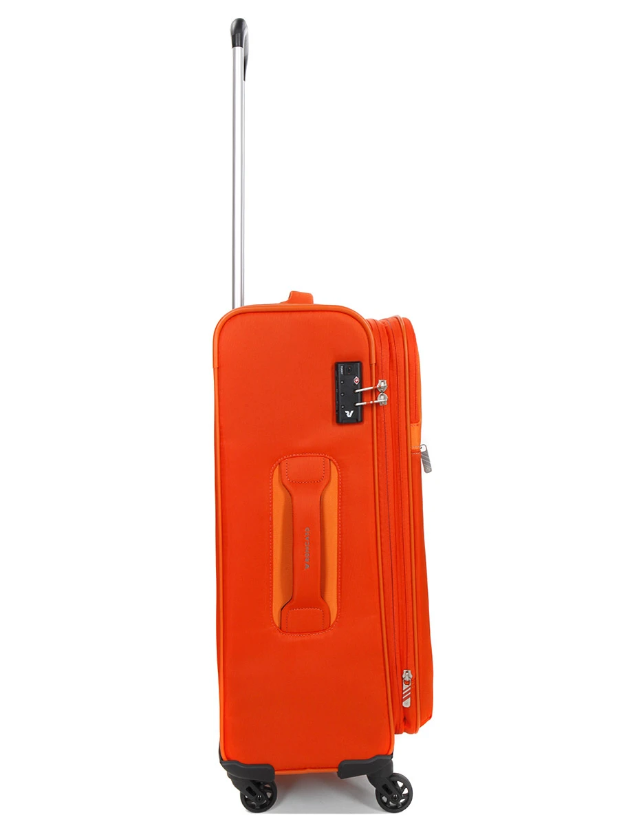 La valise extensible Roncato Speed est équipée d’une serrure TSA à code pour sécuriser son contenu simplement et faciliter les contrôles douaniers, évitant ainsi que la valise ne soit abîmée. Toujours pour préserver son intégrité, elle est munie d’un patin de protection sur l’arrière, utile notamment lorsqu’elle franchit un trottoir. Ses 4 roues doubles et son trolley double tube la rendent facilement maniable qu’elle soit tractée à l’arrière, ou à côté de soi. Quand le moment vient de la poser sur le tapis d’enregistrement, les deux poignées de portage rembourrées sont particulièrement appréciables.
